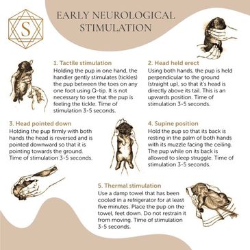 Early neurological stimulation is a series of exercises that are designed to stimulate the neurological system of puppies during a critical period of their development, typically between the ages of 3 and 16 days. These exercises are believed to have a number of benefits, including enhancing the puppy's physical and mental development, im
